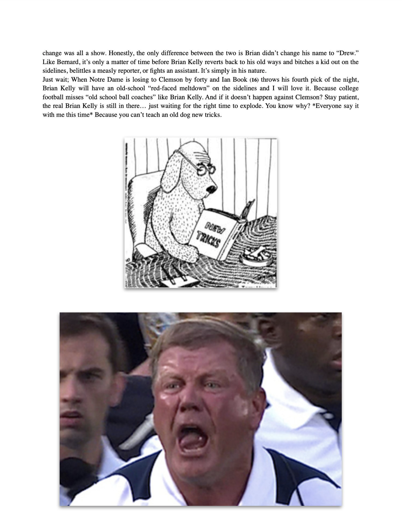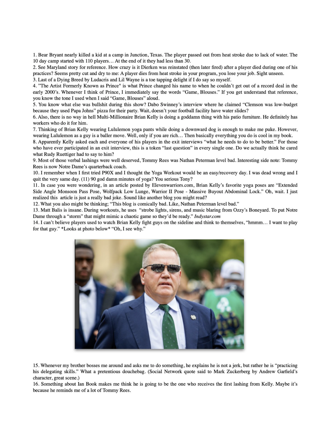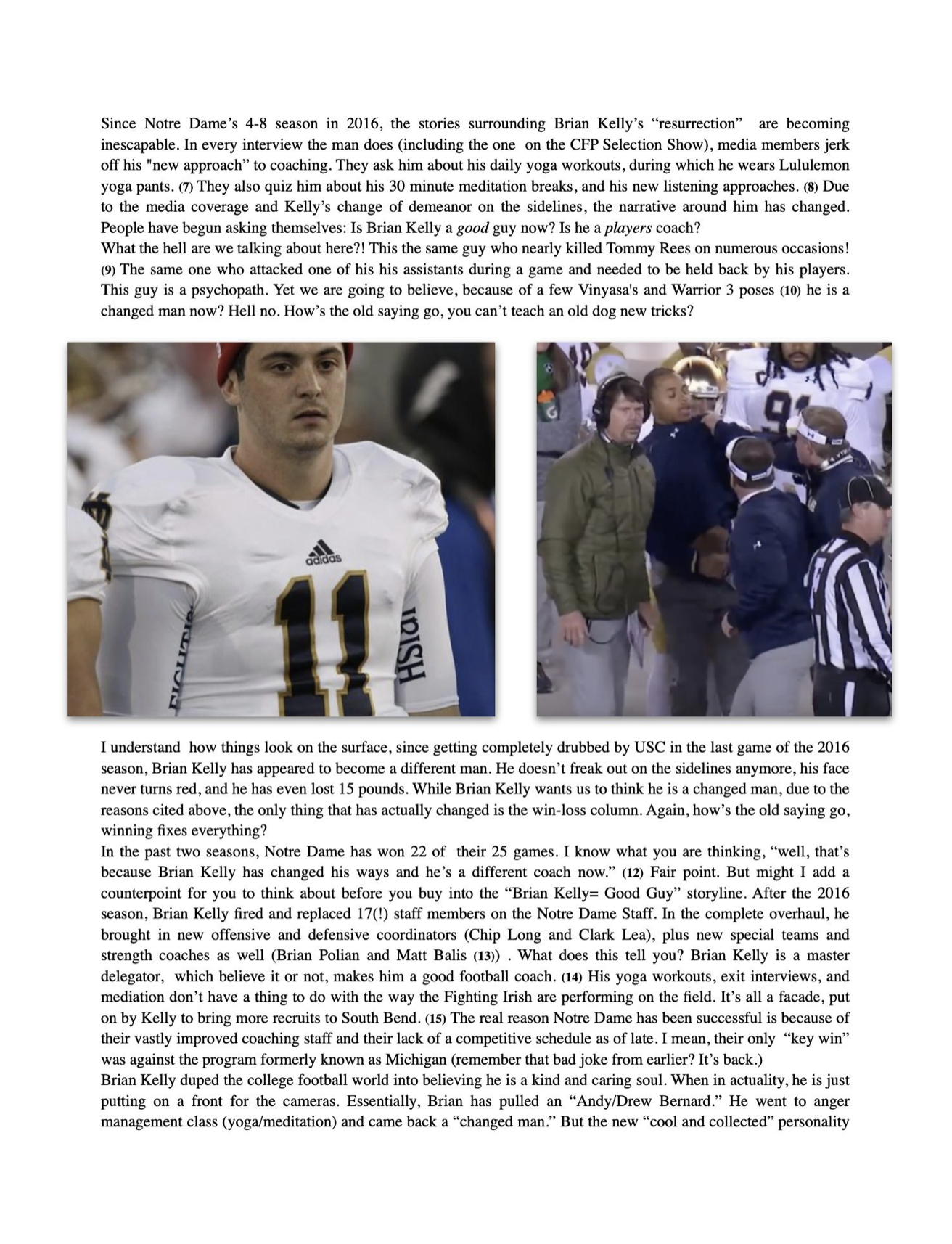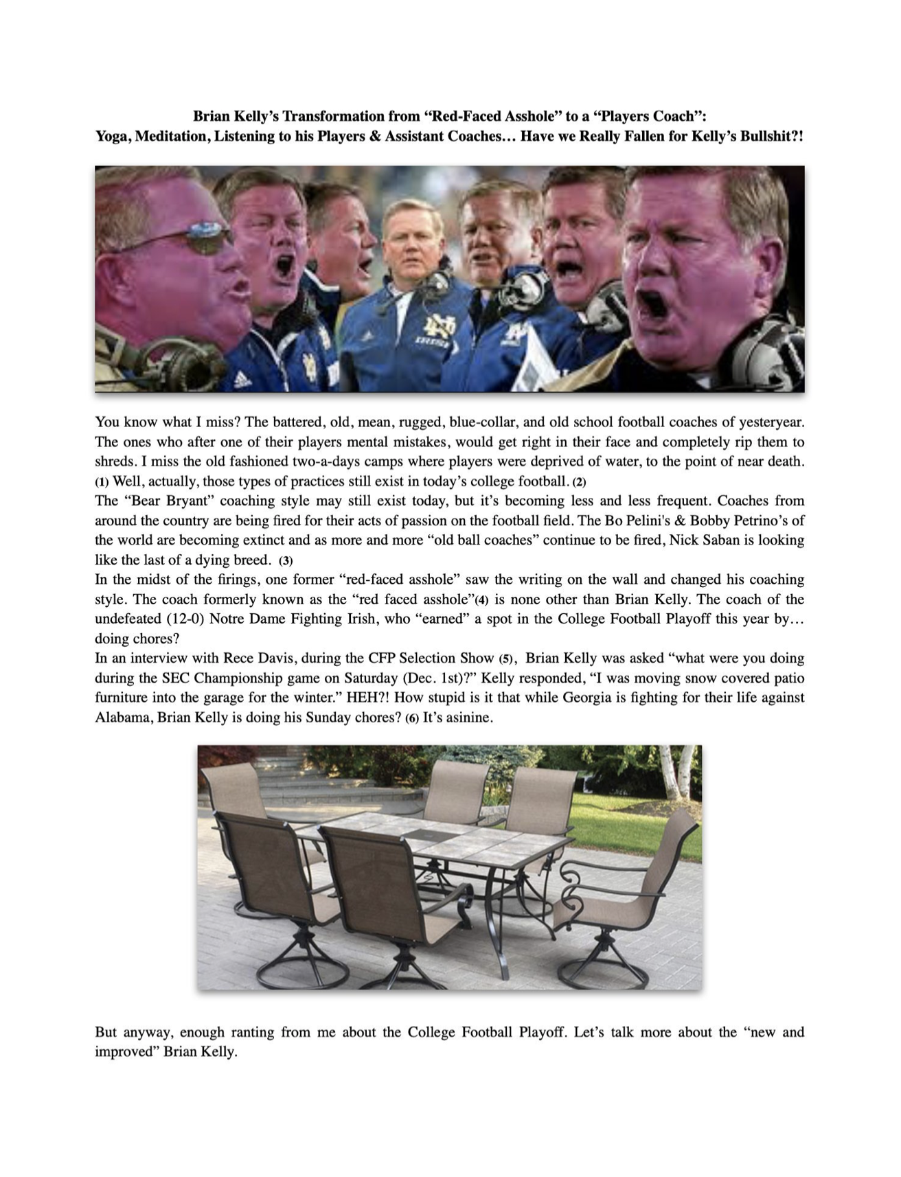 Brian Kelly’s Transformation from “Red-Faced Asshole” to a “Players Coach”: Yoga and Meditation… Listening to his Players and Assistant Coaches… Have we Really Fallen for Kelly’s Bullshit?! *Published 12/11/2018* Share this: Click to share on X (Opens in new window) X Click to share on Facebook (Opens in new window) Facebook Like Loading... Related Leave a comment Cancel reply Δ
