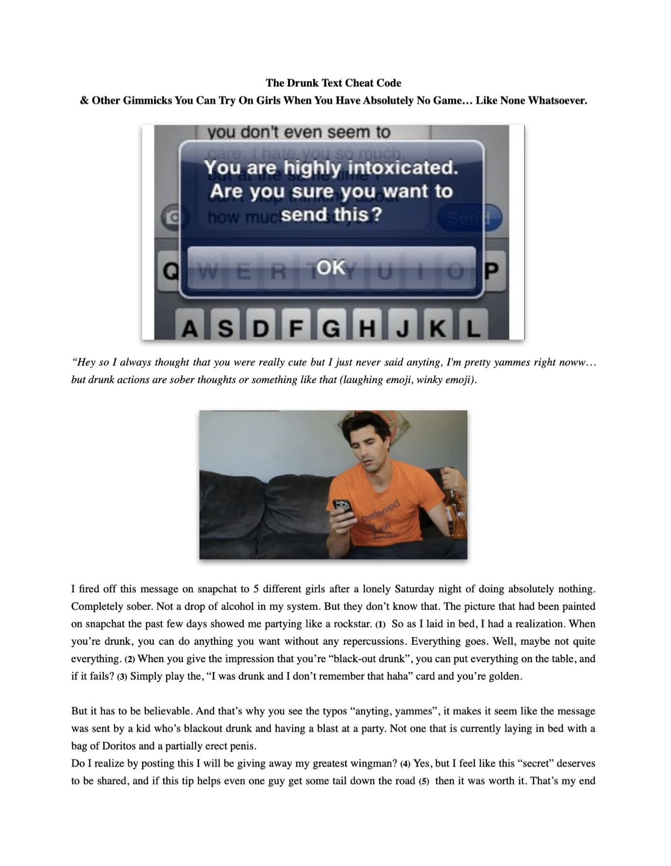 The Drunk Text Cheat Code & Other Gimmicks You Can Try On Girls When You Have Absolutely No Game… Like None Whatsoever. *Published 12/20/2018* Share this: Click to share on X (Opens in new window) X Click to share on Facebook (Opens in new window) Facebook Like Loading... Related Leave a comment Cancel reply Δ