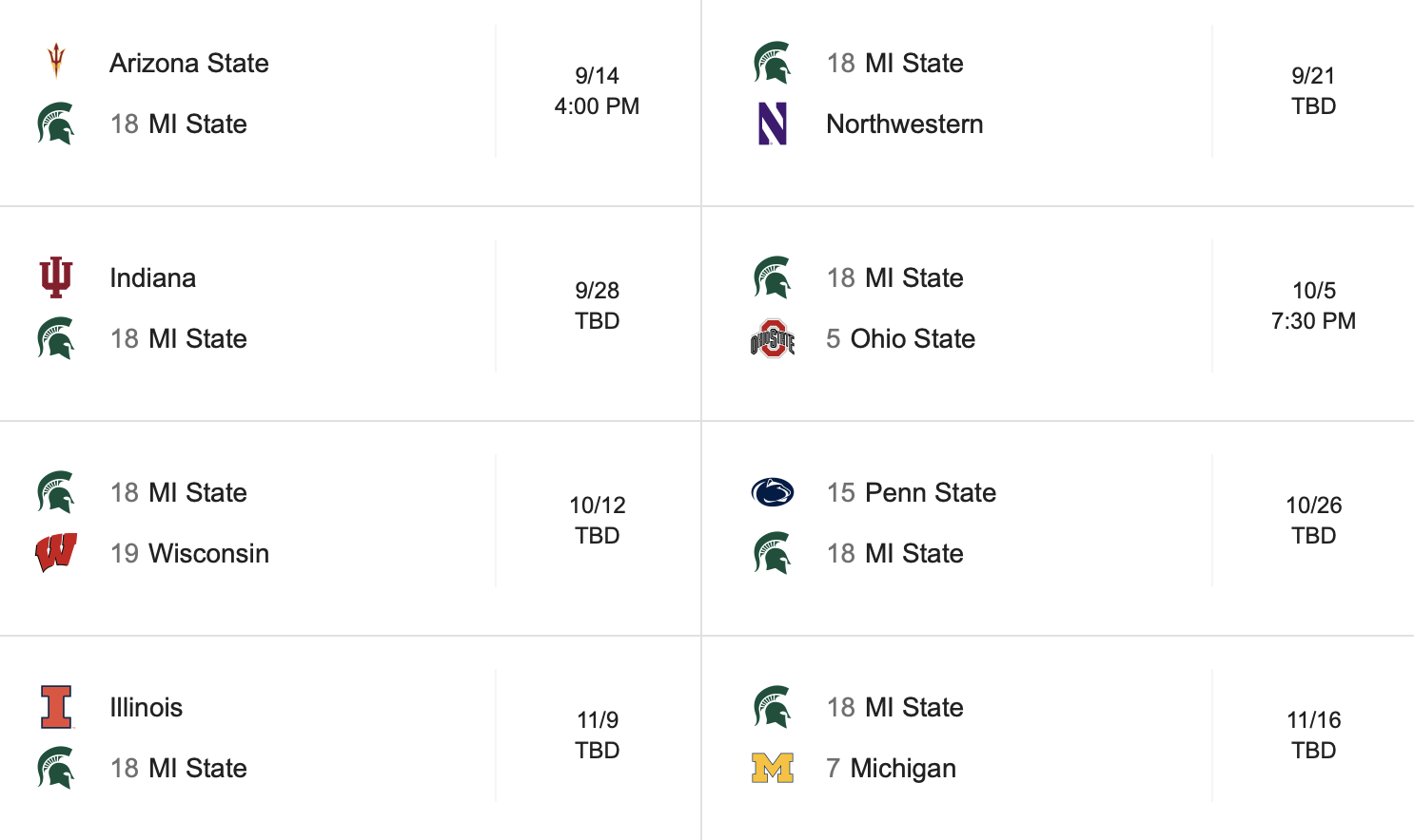 Offense isn’t the only problem that plagues this MSU team, an absolutely BRUTAL schedule might also cause a few problems. Not only does MSU play Northwestern, Ohio State, Wisconsin, & Michigan all on the road, but they also play Arizona State (who is no slouch, as you know from last year) and Penn State as well. Worst of all, the Spartans have to play these teams all of these teams within a 9 week span… It’s the definition of a “murderers row”.*