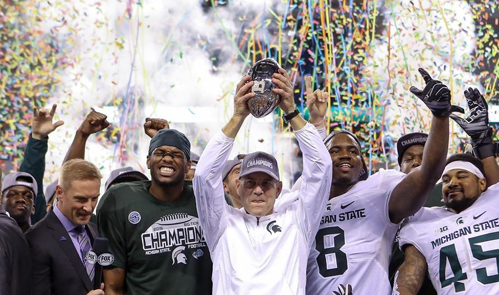 This guy made MSU football a national brand and gave their fans a voice, a rallying cry “pride comes before the fall” to combat the Michigan fans who heavily outnumbered him. He brought life back into a rivalry that had been dead for years. He took a down-and-out MSU program, that was still reeling from what coaches Bobby Williams and John L. Smith had done to them and turned them into a College Football Playoff team. He did that. Not the administration, the fans, or his assistants. Him.