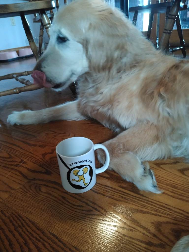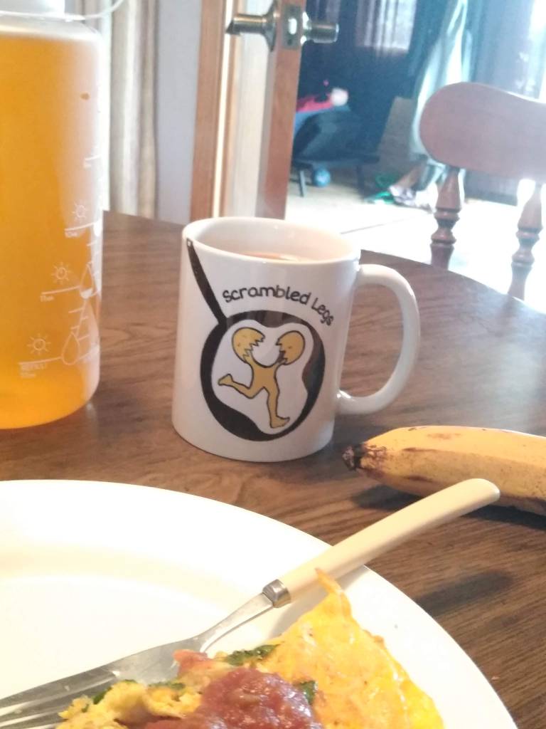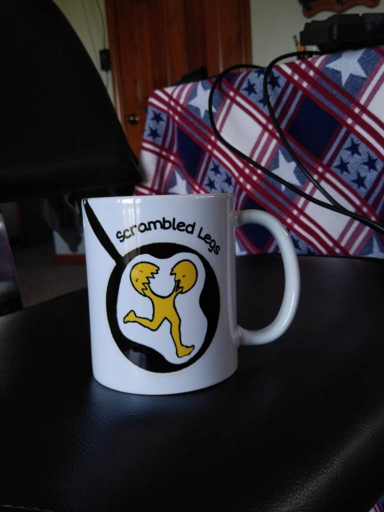 Above is an image of my breakfast this morning, more specifically, the Scrambled Legs Mug that held my hot Joe that I drank along with my eggs, bagels, and banana. The first thing that you’ll notice about the mug is that I lied earlier: this mug is not actually super supremo extremo, it’s just a regular mug. The thing is, though, with a coffee mug you really don’t need any extra frills to help you enjoy your coffee, you just need a tried and true classic workhorse that you know you can trust to get you through your morning slurp.
